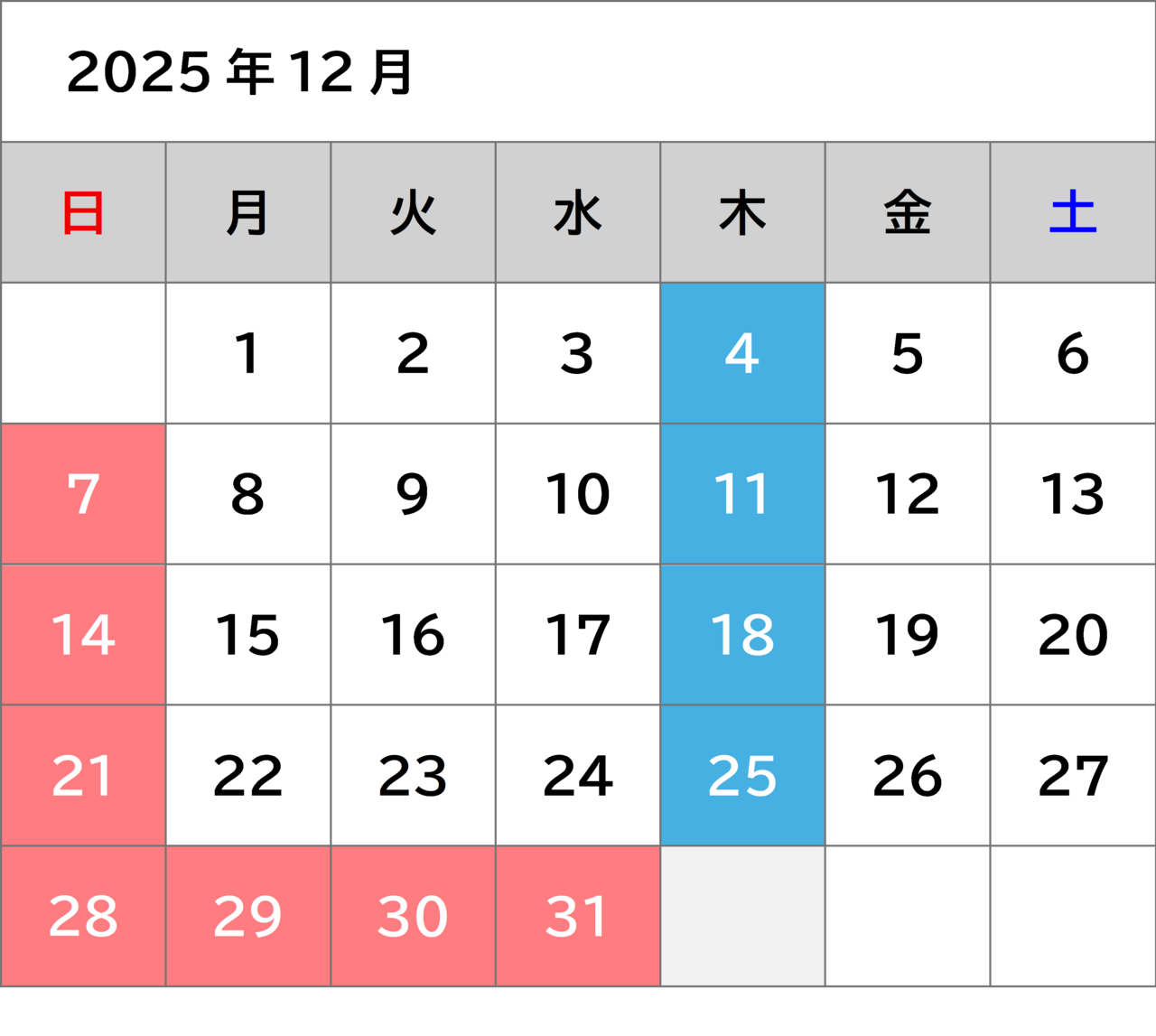 | 午後 | ○ | ○ | ○ | ✕ | ○ | ○ | ✕ |